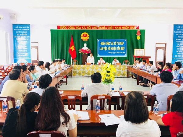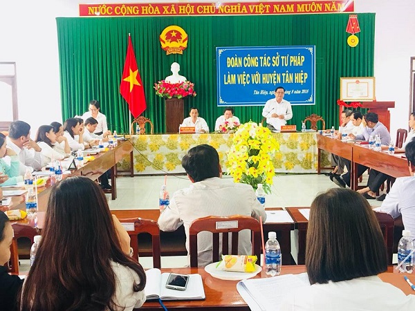 Nhằm tháo gỡ những khó khăn, vướng mắc trong công tác tư pháp năm 2018, chiều ngày 07/8/2018, Đoàn công tác của Sở Tư pháp do đồng chí Lâm Minh Công, Giám đốc Sở Tư pháp và cùng các đồng chí Lãnh đạo các phòng chuyên môn thuộc Sở Tư pháp đã đến làm việc tại huyện Tân Hiệp. Tham dự buổi làm việc cùng Đoàn có đồng chí Trần Hoàng Thanh – Phó Chủ tịch Hội đồng nhân dân huyên; đồng chí Trần Minh Vũ – Phó Chủ tịch Uỷ ban nhân dân huyện, các đồng chí lãnh đạo các Phòng: Tư pháp, Nội vụ, Tài chính, Tài nguyên và Môi trường, Chi nhánh Văn phòng đăng ký đất đai, Lãnh đạo Ủy ban nhân dân các xã, thị trấn và các công chức Tư pháp – Hộ tịch cấp xã.